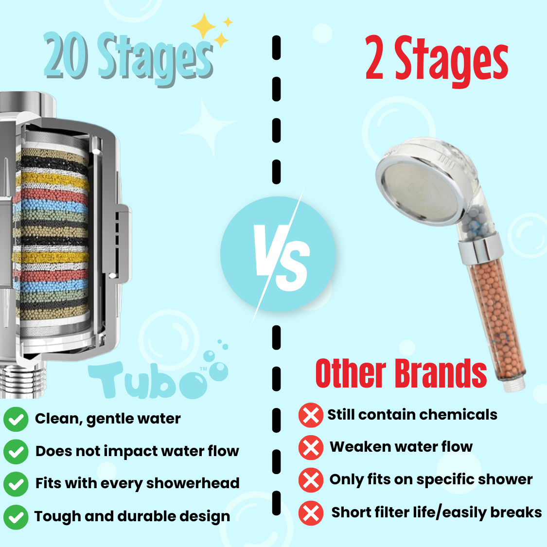Tubo's advanced 20-stage filtration system eliminates up to 99% of harmful contaminants, including chlorine, heavy metals and bacteria.